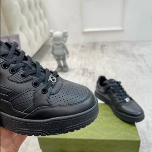 The ultimate in men’s footwear sophistication: the Gucci Men’s Sneaker. Crafted from premium black leather, these sneakers exude refinement and versatility. Featuring intricate black perforated leather inserts and rubber details, they offer both style and durability. The iconic Gucci script and interlocking G detail on the laces showcase the brand’s timeless elegance. With a rubber sole for comfort and traction, along with a lace-up closure for a secure fit, these sneakers seamlessly blend fashion with function. Elevate your everyday look with these flat-laced wonders from Gucci.