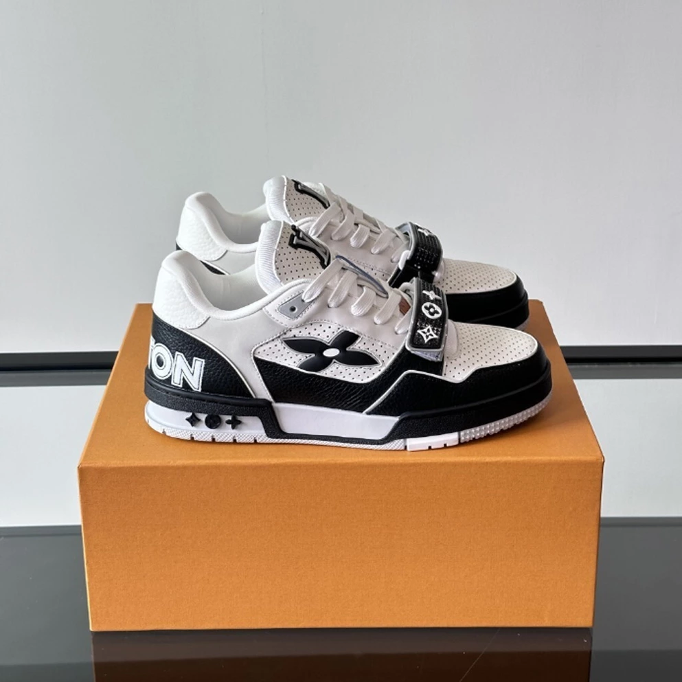 The iconic LV Trainer are revisited this season in smooth calf leather decorated with pinpoint perforations. Inspired by vintage basketball shoes, this model is notable for its elaborately constructed upper and its multiple signature details. These include a Monogram Flower on the side and an asymmetrical Louis and Vuitton signature at the back.